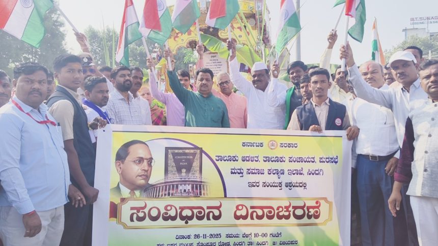 ಸಿಂದಗಿ ಪಟ್ಟಣದ ಬಸವ ಮಂಟಪದಲ್ಲಿ ತಾಲೂಕು ಆಡಳಿತ, ತಾಲೂಕು ಪಂಚಾಯತ್, ಪುರಸಭೆ ಮತ್ತು ಸಮಾಜ ಕಲ್ಯಾಣ ಇಲಾಖೆ ಇವುಗಳ ಸಂಯುಕ್ತ ಆಶ್ರಯದಲ್ಲಿ ಹಮ್ಮಿಕೊಂಡ ಸಂವಿಧಾನ ದಿನಾಚರಣೆ ಕಾರ್ಯಕ್ರಮವನ್ನು ಉದ್ಘಾಟಿಸಿ ಮಾತನಾಡಿದ ಅವರು, ದೇಶದ ಏಕತೆ ಮತ್ತು ಸಮಗ್ರತೆಗಾಗಿ ಎಲ್ಲರಲ್ಲೂ ಸಹೋದರತೆ ಮೂಡಿಸುವುದಕ್ಕೆ ಸಂವಿಧಾನವು ರಾಷ್ಟ್ರಕ್ಕೆ ಅರ್ಪಣೆಗೊಂಡಿರುತ್ತದೆ. ಯುವ ಸಮುದಾಯ ಭಾರತದ ಸಂವಿಧಾನ ಪೀಠಿಕೆಯನ್ನು ಓದಬೇಕು. ಎಲ್ಲರೂ ಗೌರವ, ಘನತೆ, ಸ್ವಾಭಿಮಾನದಿಂದ ಬದುಕು ಕಟ್ಟಿಕೊಳ್ಳಬೇಕು ಎಂದರು.