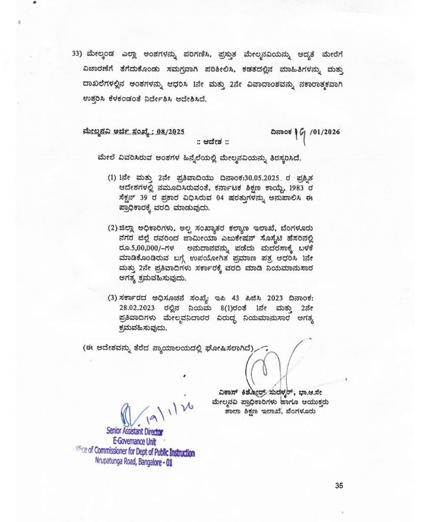 ಶಾಲಾ ಮಾನ್ಯತೆ ರದ್ದುಪಡಿಸಿದ್ದ ಶಾಲಾ ಶಿಕ್ಷಣ ಇಲಾಖೆಯ ಹಿಂದಿನ ಆದೇಶ ಪ್ರಶ್ನಿಸಿ ಅಲ್ ಜಾಮಿಯಾ ಮೊಹಮ್ಮದೀಯ ಎಜುಕೇಷನ್ ಸೊಸೈಟಿ ಸಲ್ಲಿಸಿದ್ದ ಮೇಲ್ಮನವಿ ಬಗ್ಗೆ ಸುದೀರ್ಘವಾದ ವಾದ ಪ್ರತಿವಾದ ಆಲಿಸಿದ ಶಾಲಾ ಶಿಕ್ಷಣ ಇಲಾಖೆ ಆಯುಕ್ತರು 36 ಪುಟಗಳ ಸಮಗ್ರ ಹಾಗೂ ವಿಶೇಷವಾದ ಆದೇಶ ಹೊರಡಿಸಿದ್ದಾರೆ.